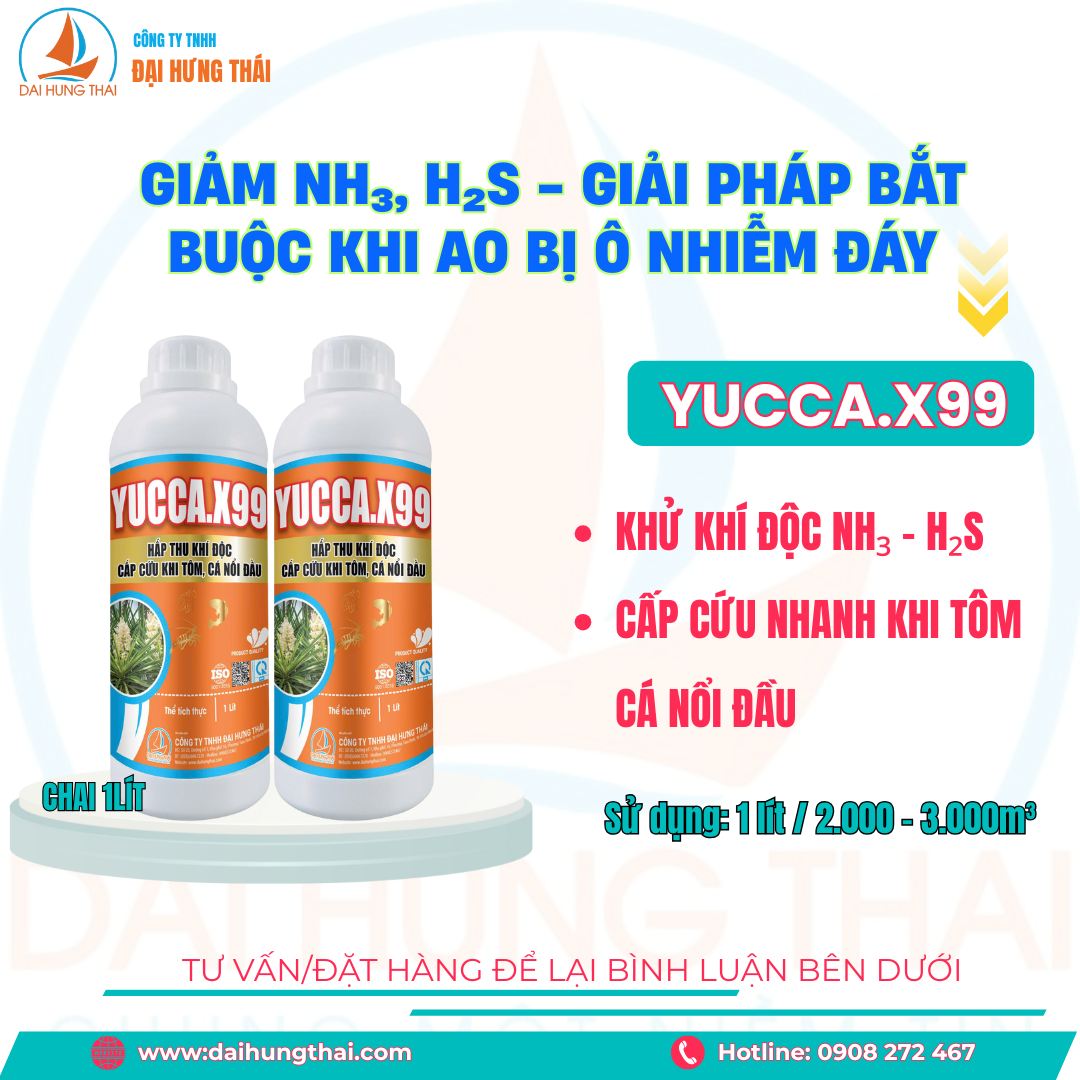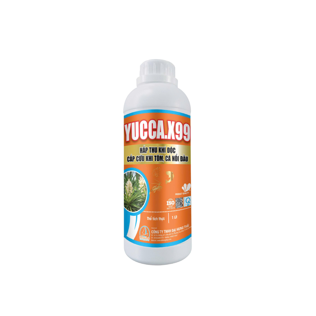YUCCA.X99 là sản phẩm chuyên dùng trong nuôi trồng thủy sản, với công thức đột phá giúp hấp thu khí độc nhanh chóng và cấp cứu tôm, cá khi xảy ra hiện tượng nổi đầu do môi trường nước ô nhiễm. Sản phẩm không chỉ xử lý cấp tốc mà còn cải thiện chất lượng nước lâu dài.