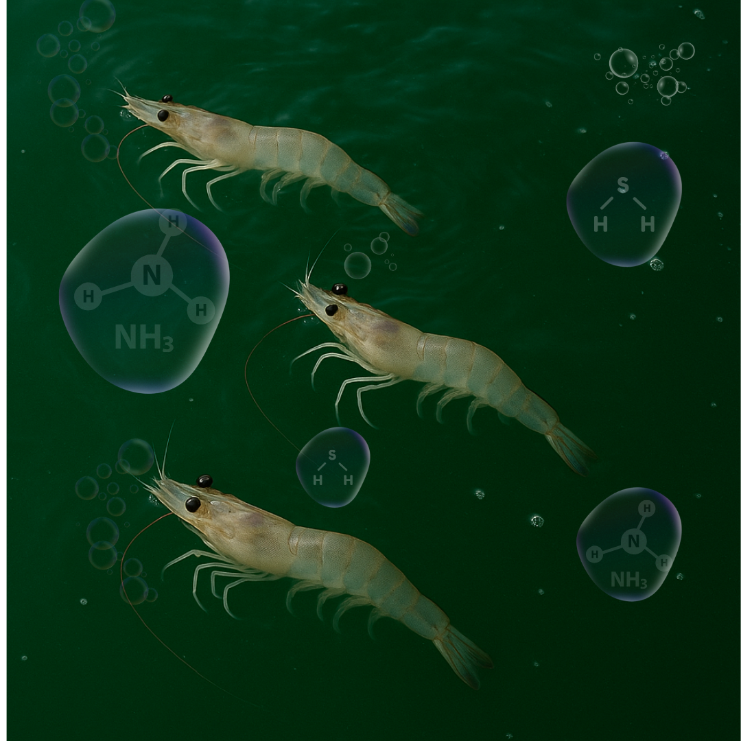 Khí độc đáy ao như NH₃ (amoniac) và H₂S (hydro sunfua) là hai loại khí cực kỳ nguy hiểm trong nuôi tôm – thường phát sinh từ phân tôm, thức ăn thừa, xác tảo chết phân hủy ở đáy ao. Nếu không được xử lý kịp thời, chúng sẽ gây sốc chết cấp tính, làm tôm đục cơ, hoại tử gan tụy, chết rải hoặc chết hàng loạt.